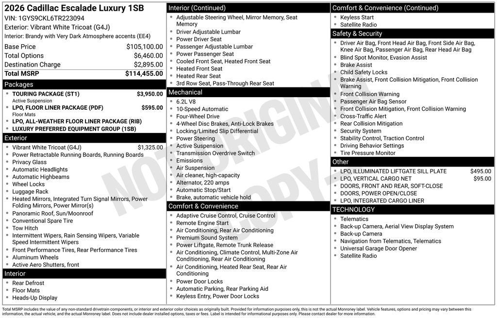 2026 Vibrant White Tricoat Cadillac Escalade Luxury 10-Speed Automatic with Overdrive 1st and 2nd Rows All-Weather Floor Liners, 2-Presets Memory For Driver Seat Adjuster, 2-Speed Active Transfer Case, 21 Speakers, 3.23 Axle Ratio, 3rd Row All-Weather Floor Liner Package, 3rd row seats: split-bench, 4-Way Power Driver Lumbar Seat Adjuster, 4-Way Power Front Passenger Lumbar Seat Adjuster, 4-Wheel Disc Brakes, 8-Way Power Driver Seat Adjuster, 8-Way Power Front Passenger Seat Adjuster, ABS brakes, Adaptive suspension, Air Conditioning, Air Ride Adaptive Suspension, AKG Studio 21-Speaker Audio System, Alloy wheels, AM/FM radio: SiriusXM with 360L, Apple CarPlay/Android Auto, Audio memory, Auto High-beam Headlights, Auto tilt-away steering wheel, Auto-dimming door mirrors, Auto-dimming Rear-View mirror, Automatic temperature control, Blind Zone Steering Assist with Trailering, Brake assist, Bumpers: body-color, Compass, Delay-off headlights, Door Lock and Latch Shields, Driver door bin, Driver vanity mirror, Dual front impact airbags, Dual front side impact airbags, Electronic Limited-Slip Differential, Electronic Stability Control, Emergency communication system: OnStar Services capable, Exterior Parking Camera Rear, Floor Liner Package, Four wheel independent suspension, Front anti-roll bar, Front Bucket Seats, Front Center Armrest w/Storage, Front dual zone A/C, Front reading lights, Fully automatic headlights, Garage door transmitter, Glass Breakage Sensor, Heads-Up Display, Heated and Ventilated Driver and Front Passenger Seats, Heated door mirrors, Heated Driver and Front Passenger Seats, Heated front seats, Heated rear seats, Heated steering wheel, Hitch Guidance with Hitch View, Illuminated entry, Illuminated Liftgate Sill Plate, Illuminating Front and Rear Sill Plates, Integrated Cargo Liner, Integrated Trailer Brake Controller, Knee airbag, Lane Departure Warning System, Leather Seating Surfaces with Precision Perforated Inserts, Low tire pressure warning, Magnetic Ride Control Suspension, Memory seat, Navigation System, Occupant sensing airbag, Outside temperature display, Overhead airbag, Overhead console, Panic alarm, Passenger door bin, Passenger vanity mirror, Power door mirrors, Power driver seat, Power Liftgate, Power moonroof, Power Open/Close Doors, Power Panoramic Tilt-Sliding Sunroof, Power passenger seat, Power steering, Power windows, Power-Retractable Assist Steps, Preferred Equipment Group 1SB, Radio data system, Radio: Infotainment Experience, Rain sensing wipers, Rear air conditioning, Rear anti-roll bar, Rear reading lights, Rear window defroster, Rear window wiper, Reconfigurable Full-Color Head-Up Display, Remote keyless entry, Security system, SiriusXM with 360L Trial Subscription, Smart Trailer Integration Indicator, Soft Closing Front and Rear Doors, Speed control, Split folding rear seat, Spoiler, Steering wheel memory, Steering wheel mounted audio controls, Tachometer, Telescoping steering wheel, Theft-Deterrent Alarm System, Tilt steering wheel, Touring Package, Traction control, Trailering App, Trailering Assist Guidelines, Trip computer, Turn signal indicator mirrors, Variably intermittent wipers, Vehicle Inclination Sensor, Vehicle Interior Movement Sensor, Ventilated front seats, Vertical Cargo Net, Voltmeter, Wheel Locks, Wheels: 22 9-Spoke Alloy with Polished Finish, Wireless Apple CarPlay/Wireless Android Auto.
