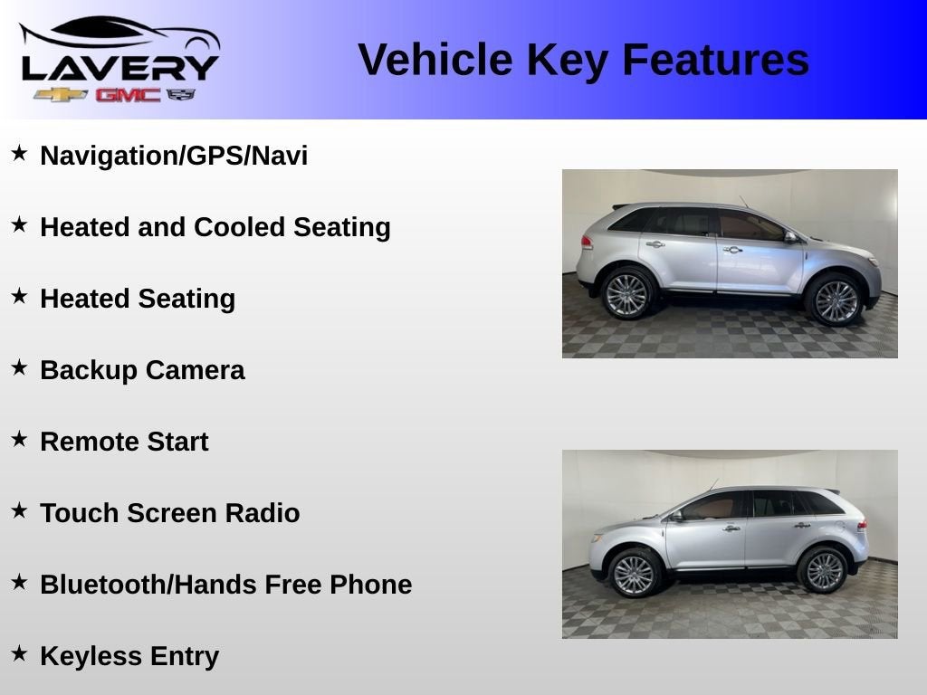 **For Sale: 2014 Lincoln MKX with features such as *Heated and Cooled front seats*, *Bluetooth®/Hands free phone*, *Remote vehicle start*, *Keyless open*, *Rear view camera*, and much more listed below!!**On the outside, the **Lincoln MKX** stands out with its bold front grille, sleek body lines, and sophisticated design that gives it a strong yet refined presence on the road. Riding on **20-inch wheels**, it has a confident and upscale look while delivering a smooth and comfortable ride.Step inside and you’ll find a **Luxurious and well-appointed cabin** with high-quality materials and comfortable seating for up to five passengers. Stay connected with an **8-inch touchscreen featuring **Bluetooth®/Hands free phone**, making it easy to access calls, music, and more while on the road. This MKX also features **Keyless entry** for added convenience.Comfort is a priority with **Heated and cooled front seats** to keep you comfortable year-round. **Cruise control/Speed control** makes longer highway drives easier, while **Remote vehicle start** lets you start the vehicle from a distance. A **Rear view camera** provides extra confidence when reversing and parking.If you’re looking for a **luxury SUV that combines comfort, performance, and timeless style**, this **2014 Lincoln MKX** is an excellent choice. Visit **Lavery Automotive** or call **(330)-800-4048** to schedule your test drive todayRecent Arrival! If you are interested in shopping for a vehicle please send us an email, call or chat. We can use video and provide you all the information you need without coming into the dealership. Our Internet Sales team can help you gather information remotely. We can arrange for you to test drive the vehicle at your home (within proximity to our dealership) If you do decide to purchase we can DocuSign or deliver the vehicle to you or arrange an appointment to pick it up at the dealership. Check out on Google our 5 star reviews from real customers! Completely satisfied with their buying experience.Though we try our best to remove vehicles when sold please confirm information and availability before making a purchase decision.Awards:* JD Power Initial Quality Study (IQS) * 2014 KBB.com 5-Year Cost to Own AwardsDealership is not responsible for clerical, computer generated or data entry errors as it relates to vehicles, prices, equipment or incentives. Though we try our best to remove vehicles when sold please confirm information and availability before making a purchase decision.
