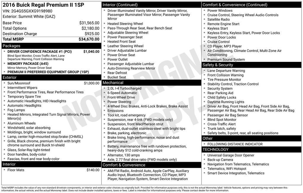 **For Sale: 2016 Buick Regal Premium II with features such as a *Sunroof/Moonroof*, *Cruise control/Speed control*, *Bluetooth®/hands free phone*, *Rear view camera*, and much more listed below!!**