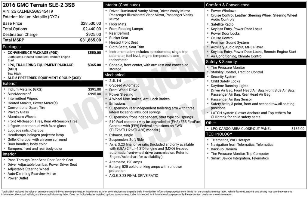17 x 7 Aluminum Wheels, 3.23 Axle Ratio, 4-Wheel Disc Brakes, 8 Speakers, 8-Way Power Driver Seat Adjuster, ABS brakes, Air Conditioning, Alloy wheels, AM/FM radio: SiriusXM, Auto-dimming Rear-View mirror, Automatic temperature control, Brake assist, Bumpers: body-color, Cargo Area Close-Out Panel (LPO), Class II 1-1/4 Receiver Hitch, Compass, Convenience Package, Delay-off headlights, Driver door bin, Driver vanity mirror, Dual front impact airbags, Dual front side impact airbags, E10 Fuel Capable, Electronic Stability Control, Emergency communication system, Exterior Parking Camera Rear, Four wheel independent suspension, Front anti-roll bar, Front Bucket Seats, Front Center Armrest, Front reading lights, Fully automatic headlights, Heated door mirrors, Heated Driver & Front Passenger Seats, Illuminated entry, Intellilink w/Bluetooth®, Low tire pressure warning, Occupant sensing airbag, Outside temperature display, Overhead airbag, Panic alarm, Passenger door bin, Passenger vanity mirror, Pioneer Premium 8-Speaker System, Power door mirrors, Power driver seat, Power steering, Power Tilt-Sliding Sunroof w/Express Open, Power windows, Preferred Equipment Group 3SB, Premium Cloth Seat Trim, Radio data system, Radio: Color Touch AM/FM Stereo, Rear anti-roll bar, Rear seat center armrest, Rear window defroster, Rear window wiper, Remote keyless entry, Remote Vehicle Start, Roof rack: rails only, Security system, Single-Zone Automatic Climate Control, SiriusXM Satellite Radio, Speed control, Speed-sensing steering, Split folding rear seat, Spoiler, Steering wheel mounted audio controls, Tachometer, Telescoping steering wheel, Tilt steering wheel, Traction control, Trailering Equipment Package (LPO), Trip computer, Variably intermittent wipers. Recent Arrival! If you are interested in shopping for a vehicle please send us an email, call or chat. We can use video and provide you all the information you need without coming into the dealership. Our Internet Sales team can help you gather information remotely. We can arrange for you to test drive the vehicle at your home (within proximity to our dealership) If you do decide to purchase we can DocuSign or deliver the vehicle to you or arrange an appointment to pick it up at the dealership. Check out on Google our 5 star reviews from real customers! Completely satisfied with their buying experience.22/32 City/Highway MPGThough we try our best to remove vehicles when sold please confirm information and availability before making a purchase decision.Awards:* JD Power Initial Quality Study (IQS) * 2016 IIHS Top Safety Pick * 2016 IIHS Top Safety Pick with optional front crash prevention * 2016 KBB.com Brand Image AwardsDealership is not responsible for clerical, computer generated or data entry errors as it relates to vehicles, prices,equipment or incentives. Though we try our best to remove vehicles when sold please confirm information and availability before making a purchase decision.