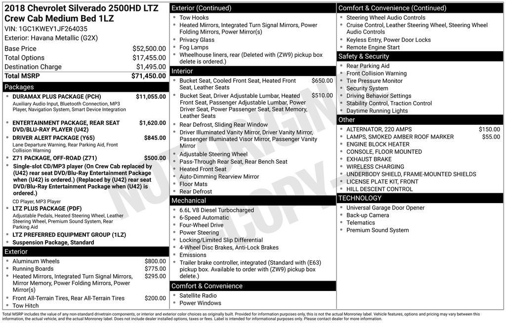 **For Sale: 2018 Chevrolet Silverado 2500HD LTZ with features such as *Heated & Ventilated front seats*, *Bluetooth®/Hands free phone*, *Cruise control/Speed control*, *Rear view camera*, and much more listed below!!**This **2018 Chevrolet Silverado 2500HD LTZ** is a powerful and refined heavy-duty truck built to handle serious work while delivering premium comfort. With **Only one previous owner**, this Silverado has been well cared for and is ready to take on its next chapter with strength and reliability.Under the hood, the Silverado 2500HD is engineered for impressive towing and hauling capability, making it ideal for job sites, trailers, or recreational equipment. Stay connected and in control with an **8-inch touchscreen display featuring **Bluetooth®/Hands free phone** and **Apple CarPlay/Android audio**, putting navigation, music, and hands-free communication right at your fingertips.Enjoy added convenience with **Remote keyless entry** and **Remote vehicle start**, making access and climate control effortless. Long drives are even more comfortable with **Cruise control/Speed control**, while **Heated and ventilated front seats** provide year-round comfort no matter the weather.On the exterior, bold styling and a commanding stance are enhanced by stylish **20-inch wheels**, giving this Silverado an even stronger road presence. A **Rear view camera** adds confidence and visibility when backing up or maneuvering in tight spaces.Built tough yet designed with refinement in mind, this **2018 Chevrolet Silverado 2500HD LTZ** delivers heavy-duty performance paired with premium comfort — ready to work hard and ride in style. Visit **Lavery Automotive** or call **(330)-800-4048** to schedule your test drive today!Recent Arrival! If you are interested in shopping for a vehicle please send us an email, call or chat. We can use video and provide you all the information you need without coming into the dealership. Our Internet Sales team can help you gather information remotely.