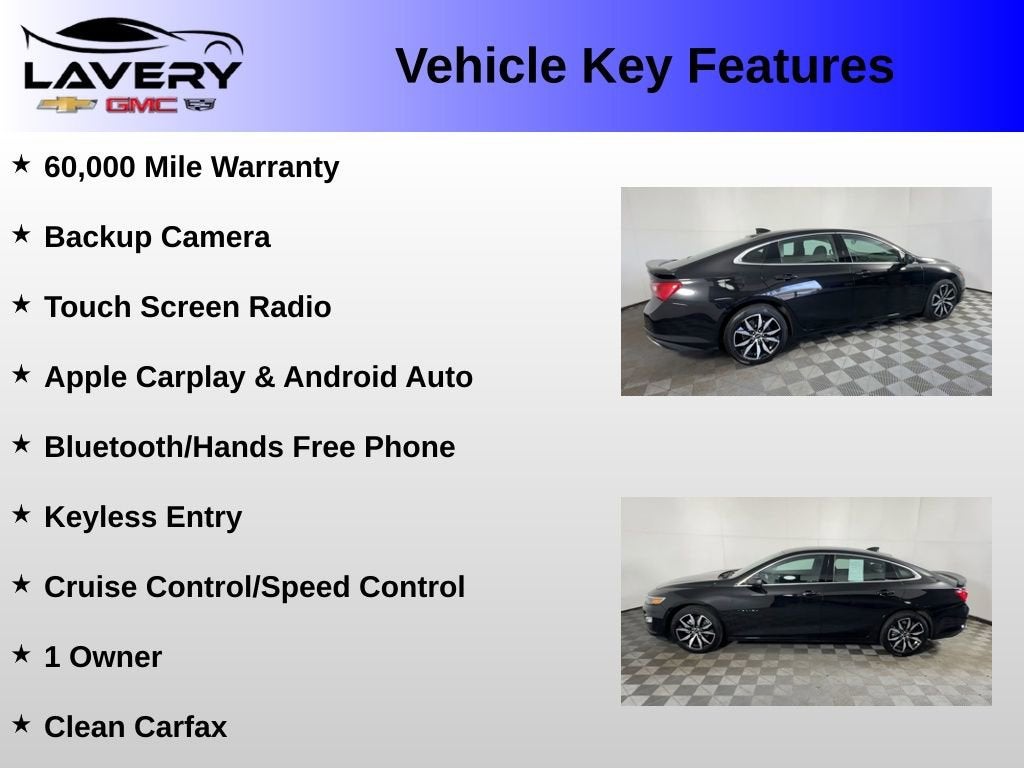 With its **Sporty styling, modern technology, efficient performance, and the added confidence of one previous owner plus a 60,000 mile warranty**, this 2022 Chevrolet Malibu RS is a smart choice for anyone looking for a stylish and reliable sedan. Visit **Lavery Automotive** or call **(330)-800-4048** to schedule your test drive today!