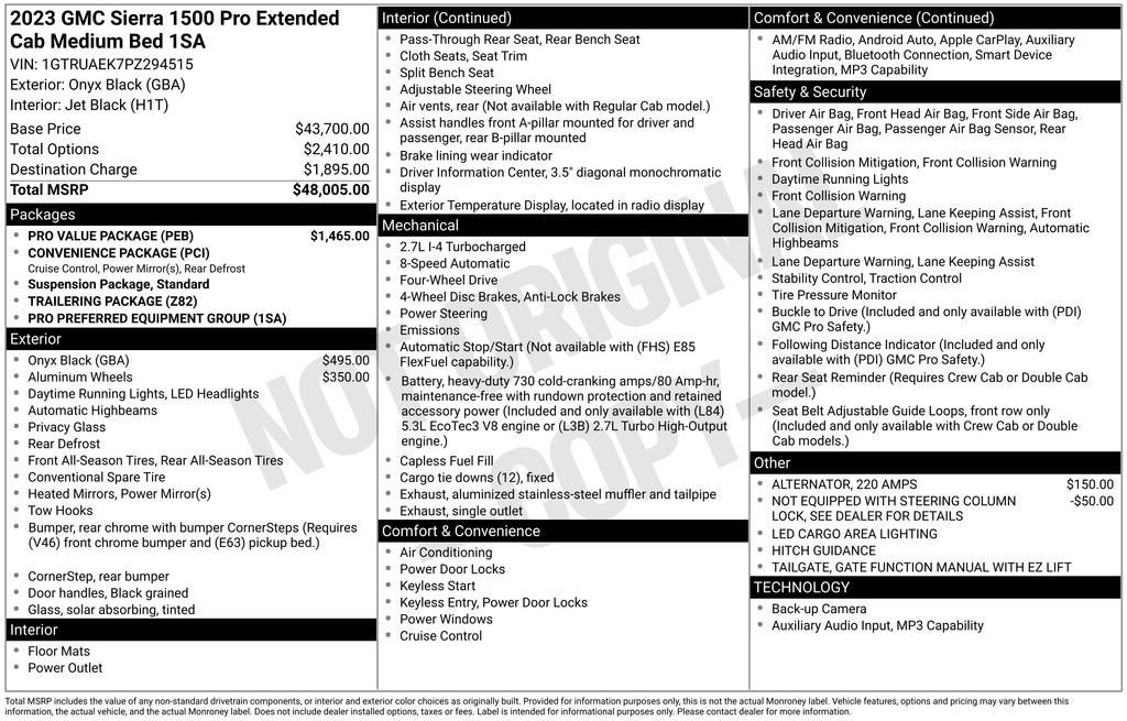 2 Charge/Data USB Ports, 220 Amp Alternator, 3.42 Rear Axle Ratio, 4-Way Manual Driver Seat Adjuster, 4-Way Manual Passenger Seat Adjuster, 4-Wheel Disc Brakes, 6 Speakers, 6-Speaker Audio System Feature, ABS brakes, Air Conditioning, AM/FM radio, Apple CarPlay/Android Auto, Auto High-beam Headlights, Automatic Emergency Braking, Black Manual Outside Mirrors, Brake assist, Buckle to Drive, Bumpers: chrome, Chrome Header w/Flat Black Grille Insert Bars, Convenience Package, Cruise Control, Deep-Tinted Glass, Delay-off headlights, Driver door bin, Dual front impact airbags, Dual front side impact airbags, Electric Rear-Window Defogger, Electrical Steering Column Lock, Electronic Stability Control, EZ Lift Power Lock & Release Tailgate, Following Distance Indicator, Forward Collision Alert, Front 40/20/40 Split-Bench Seat, Front anti-roll bar, Front Center Armrest w/Storage, Front Frame-Mounted Black Recovery Hooks, Front Pedestrian Braking, Front reading lights, Front wheel independent suspension, Fully automatic headlights, HD Rear Vision Camera, Heated Power-Adjustable Outside Mirrors, Hitch Guidance, Illuminated entry, IntelliBeam Automatic High Beam On/Off, Lane Keep Assist w/Lane Departure Warning, LED Cargo Area Lighting, Low tire pressure warning, Manual Tilt-Wheel/Telescoping Steering Col (DISC), Not Equipped w/Steering Column Lock, Occupant sensing airbag, Outside temperature display, Overhead airbag, Overhead console, Panic alarm, Passenger door bin, Passenger vanity mirror, Power Door Locks, Power Front Windows w/Driver Express Up/Down, Power Front Windows w/Passenger Express Down, Power Rear Windows w/Express Down, Power steering, Power windows, Preferred Equipment Group 1SA, Premium audio system: GMC Infotainment System, Pro Value Package, Push Button Start, Radio data system, Radio: GMC Infotainment Audio System, Rear reading lights, Rear step bumper, Remote Keyless Entry, Remote keyless entry, Solar Absorbing Tinted Glass, Speed-sensing steering, Split folding rear seat, Standard Suspension Package, Tachometer, Tilt steering wheel, Traction control, Trailering Package, Trip computer, Variably intermittent wipers, Vinyl Seat Trim, Voltmeter, Wheels: 17 x 8 Bright Silver Painted Aluminum, Wheels: 17 x 8 Silver Painted Steel. Recent Arrival! If you are interested in shopping for a vehicle please send us an email, call or chat. We can use video and provide you all the information you need without coming into the dealership. Our Internet Sales team can help you gather information remotely. We can arrange for you to test drive the vehicle at your home (within proximity to our dealership) If you do decide to purchase we can DocuSign or deliver the vehicle to you or arrange an appointment to pick it up at the dealership. Check out on Google our 5 star reviews from real customers! Completely satisfied with their buying experience.