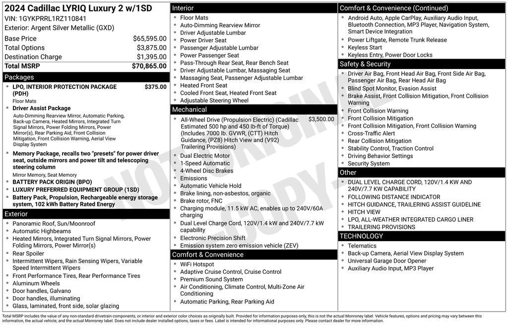 Clean CARFAX.11.63 Axle Ratio, 4-Wheel Disc Brakes, 8-Way Power Driver Seat Adjuster, ABS brakes, Air Conditioning, All-Weather Integrated Cargo Liner (LPO), Alloy wheels, AM/FM radio: SiriusXM with 360L, Apple CarPlay/Android Auto, Auto High-beam Headlights, Auto-dimming door mirrors, Auto-dimming Rear-View mirror, Automatic temperature control, Battery Pack Origin, Brake assist, Bumpers: body-color, Compass, Delay-off headlights, Driver & Front Passenger Heated Seats, Driver 4-Way Power Lumbar Seat Adjustment, Driver Assist Package, Driver door bin, Driver vanity mirror, Dual front impact airbags, Dual front side impact airbags, Electronic Stability Control, Emergency communication system: OnStar and Cadillac connected services capable, Enhanced Automatic Parking Assist, Four wheel independent suspension, Front & Rear All-Weather Floor Mats, Front anti-roll bar, Front Bucket Seats, Front Center Armrest, Front dual zone A/C, Front Passenger 4-Way Power Lumbar Seat Adjustment, Front reading lights, Fully automatic headlights, Garage door transmitter, HD Surround Vision, Heated door mirrors, Heated front seats, Heated steering wheel, Hitch Guidance w/Trailering Assist Guideline, Hitch View, Illuminated entry, Inteluxe Seat Trim, Interior Protection Package (LPO), Intersection Automatic Emergency Braking, Knee airbag, Leather steering wheel, Low tire pressure warning, Memory seat, Navigation system: Google Automotive Services Capable, Occupant sensing airbag, Outside temperature display, Overhead airbag, Overhead console, Panic alarm, Passenger door bin, Passenger vanity mirror, Power door mirrors, Power driver seat, Power Liftgate, Power passenger seat, Power steering, Power windows, Power-Folding Outside Heated Mirrors, Premium Suspension, Radio data system, Radio: Google Built-In Infotainment Experience, Rain sensing wipers, Rear anti-roll bar, Rear Pedestrian Alert, Rear reading lights, Rear seat center armrest, Rear window defroster, Remote keyless entry, Security system, Side Bicyclist Alert, SiriusXM w/360L, Speed control, Speed-sensing steering, Split folding rear seat, Spoiler, Steering wheel memory, Steering wheel mounted audio controls, Telescoping steering wheel, Tilt steering wheel, Traction control, Trip computer, Turn signal indicator mirrors, Variably intermittent wipers, Wheels: 20 Split 6-Spoke Alloy. Recent Arrival! If you are interested in shopping for a vehicle please send us an email, call or chat. We can use video and provide you all the information you need without coming into the dealership. Our Internet Sales team can help you gather information remotely. We can arrange for you to test drive the vehicle at your home (within proximity to our dealership) If you do decide to purchase we can DocuSign or deliver the vehicle to you or arrange an appointment to pick it up at the dealership. Check out on Google our 5 star reviews from real customers! Completely satisfied with their buying experience.Though we try our best to remove vehicles when sold please confirm information and availability before making a purchase decision.
