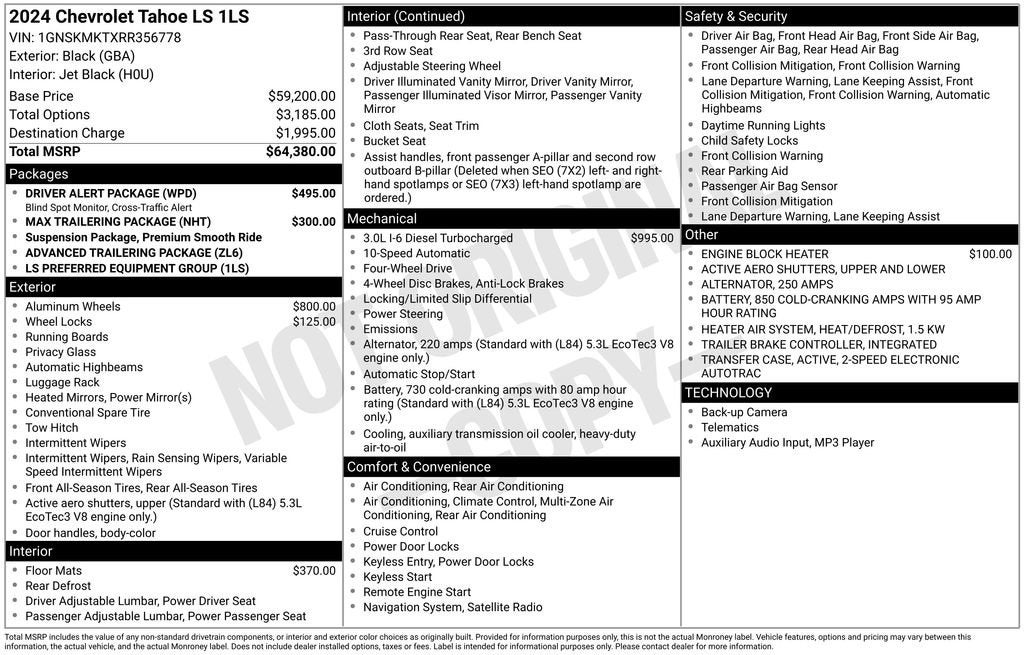 **For Sale: 2024 Chevrolet Tahoe 4WD LS with features such as *Remote keyless entry*, *Bluetooth®/Hands free phone*, *Apple car play/Android audio*, *Rear view camera*, and much more listed below!!**